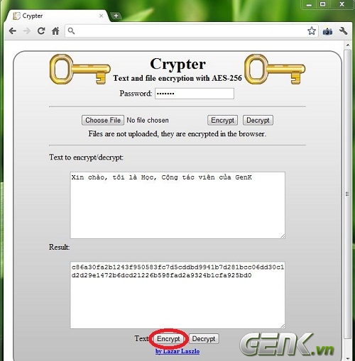 Tại giao diện của Crypter. Bạn thiết lập mật khẩu để giải mã tại ô Password. Để mã hóa văn bãn, trước hết bạn copy đoạn văn bản và dán vào ô Text to encrypt/decrypt và nhấn nút Encrypt để mã hóa. Tương tự, nếu muốn mã hóa tập tin, bạn nhấn nút Choose File để tìm đến tập tin cần mã hóa và nhấn Encrypt để Crypter bắt đầu mã hóa.